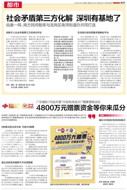 为回馈广大购彩者,经广东省民政厅批准,广东省福彩中心于7月起在全省范围内(不含深圳市)开展2024年“中双色球送3D”赠票营销活动。