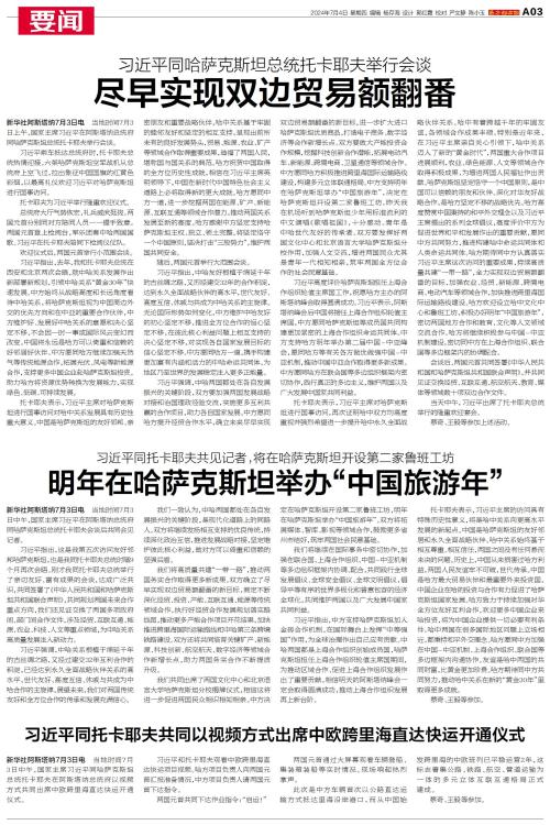 当地时间7月3日上午,国家主席习近平在阿斯塔纳总统府同哈萨克斯坦总统托卡耶夫举行会谈。