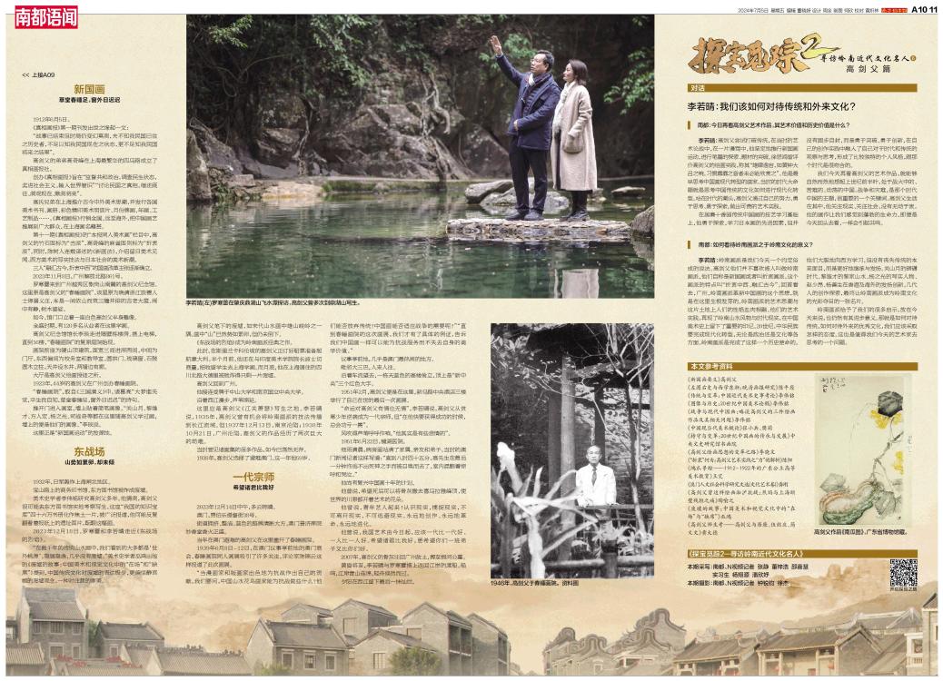 李若晴:岭南画派是我们今天一个约定俗成的说法。高剑父他们并不喜欢被人叫做岭南画派,他们自称是新国画或者叫折衷画派。这个画派的特点叫“折衷中西、融汇古今”。回首看去,广州,岭南画派革新中国画的这个思想,就是在这里生根发芽的。岭南画派的艺术思潮与这片土地上人们的性格血肉相融。他们的艺术实践,再现了岭南山水风物与时代现实,在中国美术史上留下了重要的印记。20世纪,中华民族要完成现代化转型,无论是政治还是文化等各方面。岭南画派是完成了这样一个历史使命的。他们大胆地向西方学习,但没有丧失传统的本来面目,而是更好地继承与发扬。关山月的磅礴时代、黎雄才的黎家山水、杨之光的写实人物、赵少昂、杨善生在香港及海外的发扬创新。几代人的创作探索,最终让岭南画派成为岭南文化的光彩夺目的一张名片。