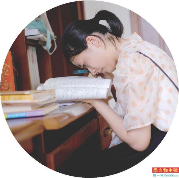 骆梓仪靠放大镜贴在书本上才能看清内容,被同学们称呼为“吻书”女孩。
