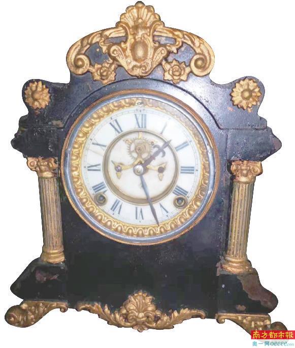 黄英英向南都记者介绍,在神台的左下角,原来安放着一只座钟。“这是卡朋蒂埃将军送给太公的珍贵礼物。当时我太公从美国回来,带了一只金钟,他很高兴地告诉我外祖母(“丁龙”长媳黄柳),这只金钟是老板送的,很名贵,有钱也买不到。我外祖母问,你老板那么有钱,干吗要送我们一只钟呀(广东人忌‘送钟’,因与‘送终’同音),意头不好啊。太公回答说那是将军送的,我当然要,我要带回来放在家里,看着这只金钟,就会想起将军。太公亲手把金钟放在神台上,天天抚摸,上发条。我外祖母后来也一直把金钟当宝贝放在神台,有固定的梯子,每天登梯上一次发条,并小心擦干净,几十年如一日。”据介绍,这只金钟是美国著名钟表制造公司安索尼亚公司于1881年7月4日制造的,长15.8cm、宽32cm、连座高37cm。“美国这种钟表早已停产,可以说每一个安索尼亚公司的钟表都是古董。马家后人把这座金钟放在神台,就意味着把卡朋蒂埃跟祖先一起供奉。”