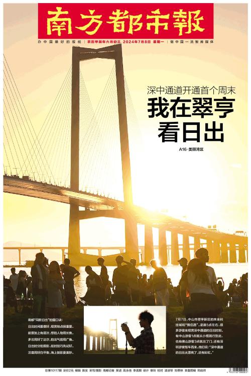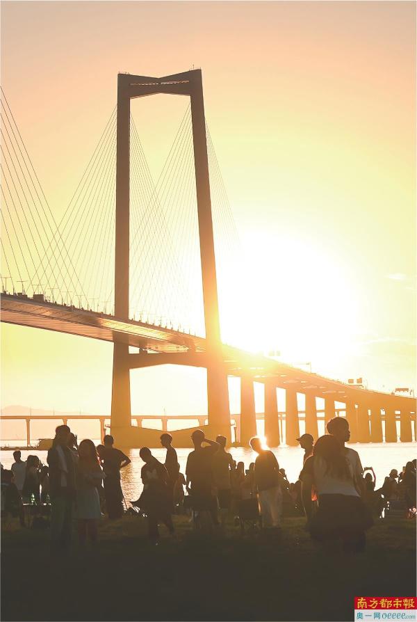 7月7日,中山市翠亨新区的未来科技城和“情侣路”。凌晨5点左右,很多游客来观赏深中通道的日出时刻。有中山游客1点就从小榄骑行到此,也有佛山游客3点就出了门,还有深圳游客驾车而来。他们说:“深中通道的日出太漂亮了,还有彩虹。”