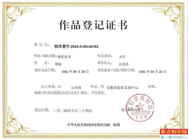 《傅雷家书》作品登记证书。 受访者供图
