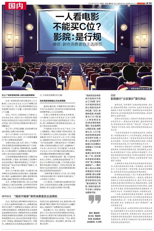 “我想购买的电影场次选座时只卖出了2张票,却不允许我单张购买核心观影区的中间位置。”近日,有媒体报道,有消费者在CGV影城(上海宝杨宝龙店)购买单张电影票时,无法选择核心观影区域。消费者认为,CGV影城的购票选座规定非常不合理。#单人买电影票不能选C位合理吗#话题登上10日微博热搜。