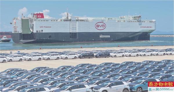 7月9日,深汕特别合作区小漠国际物流港,装载2132辆新能源汽车的滚装船缓缓离开码头。近期,小漠港汽车滚装出口累计突破5万辆。 南方日报记者 朱洪波 陶清清 摄影报道