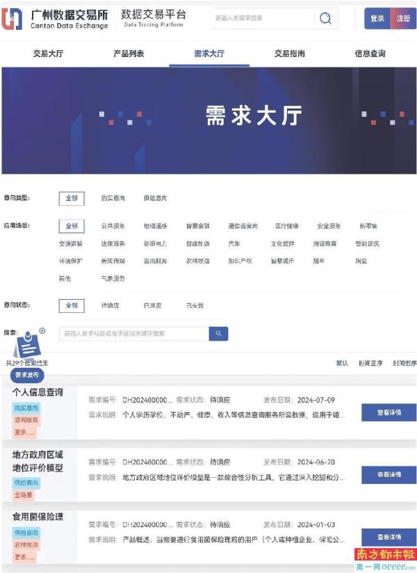 截至7月5日,广州数据交易所官网需求大厅只显示28条信息,其中3条已失效,其余处于待响应状态。