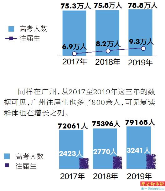 同样在广州,从2017至2019年这三年的数据可见,广州往届生也多了800余人,可见复读群体也在增长之列。