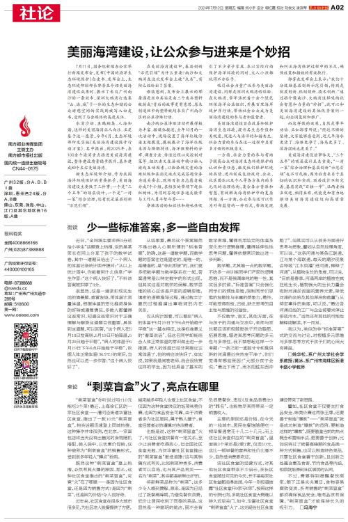 不仅数学、语文,其他方面,在与孩子的沟通与交流中,老师与家长都应该积极鼓励孩子开动脑筋、拓展思维,增进其思考问题的多元性与多样性。我不禁想起这样一个考题:“一条之前一直脏兮兮和臭烘烘的河涌最近突然变干净了,你们觉得有哪些原因?”大部分孩子会说,“最近下雨了,雨水把脏东西冲跑了”。但其实可以从很多方面进行思考与想象,譬如从自然地理角度,可以说,“这条河涌与某条江联通,江与某个海联通,每天的潮汐现象会导致‘江水倒灌’进河涌,稀释了河涌”;从植物生长的角度,可以说,“目前是春季,河涌两岸的植被在疯狂地生长,植物强大的生长力量会吸附河涌淤泥里的营养元素,降低河涌的杂质及其他浑浊物数量”;从特定事件的角度,可以说,“最近各河涌沿线的工厂与企业被要求停止排放污水。”当然还有其他的可能性解释或解读,不一而足。