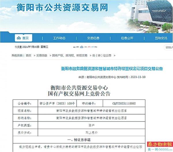 去年11月10日衡阳市公共资源交易中心发布公告,以网上竞价方式出让衡阳市政务数据资源和智慧城市特许经营权转让项目,几天后该项目被暂停。