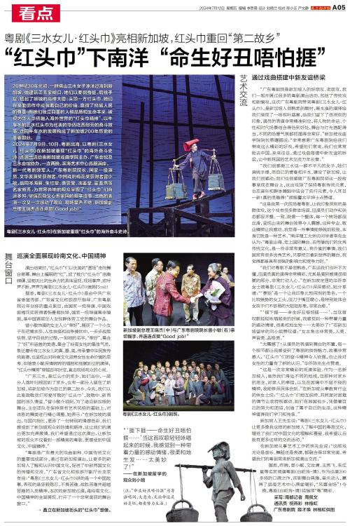 2024年7月9日、10日,粤剧出海,以粤剧《三水女儿·红头巾》在新加坡重现“红头巾”的海外奋斗史诗,该演出活动由新加坡戏曲学院主办,广东会馆及三水会馆协办。