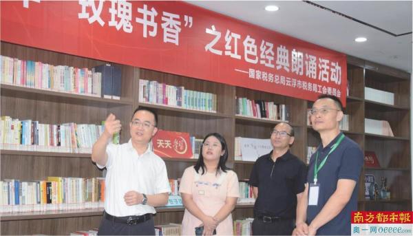 国家税务总局云浮市税务局党委委员、总经济师郑会锋(左一)在介绍“退役军人之家”。 通讯员供图