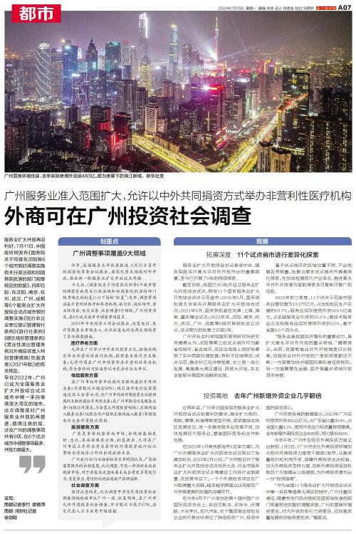 允许在广州市以中外共同捐资方式,按相关规定举办非营利性医疗机构,提供基本医疗卫生服务;允许外商在广州市捐资举办非营利性养老机构,符合条件的可依法登记为民办非企业单位。