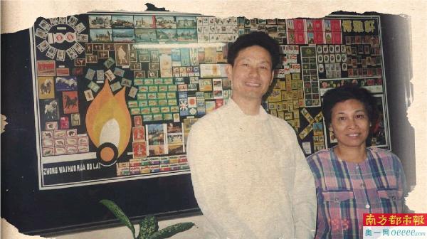 1999年,广州火柴厂美工赵咏红(右)到访李伟钦的火花收藏馆。