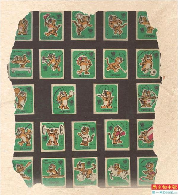 1988年,第二十四届奥运会在韩国汉城举行。韩国人选择了较具东方色彩的小老虎作为奥运会吉祥物,取名为“Hodori”。中国第一家火柴厂——广州火柴厂从韩国奥委会购得使用权,发行了一套三色贴标纪念火花,印有Hodori举重、击剑等形象,颇为可爱,大受欢迎。