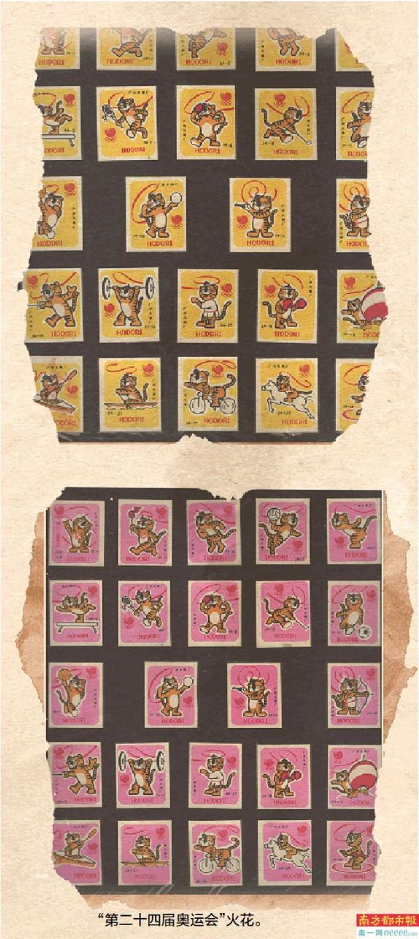 他向南都记者展示了他珍藏的“第二十四届奥运会”三色火花,黄、粉、绿三色形制、图案相同,标注着“广州火柴厂”字样,各有24枚,分别对应24项奥运比赛项目,由被称为“Hodori”的老虎吉祥物演绎。