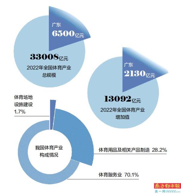 广东作为经济大省、人口强省,体育产业规模亦名列全国前茅。数据显示,2022年全国体育产业总规模(总产出)为33008亿元,增加值为13092亿元。其中,广东体育产业总规模约为6500亿元,占比约为全国的五分之一,增加值约为2130亿元。