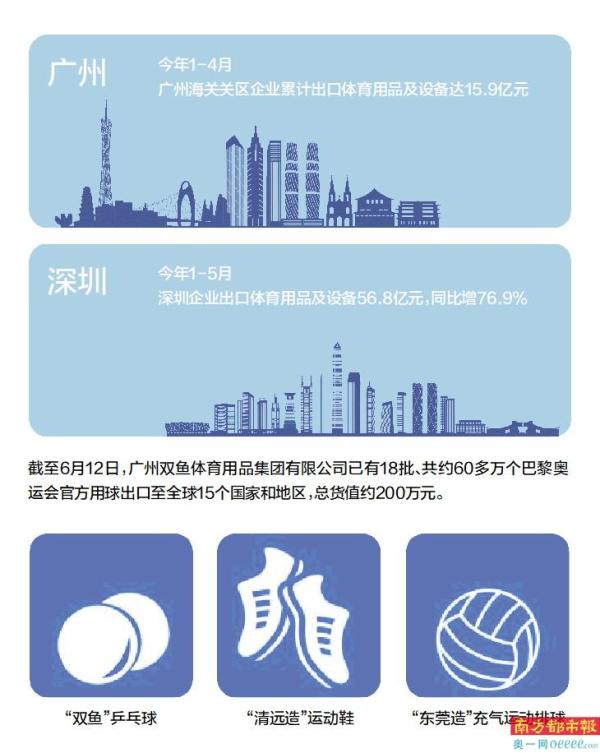 统计数据显示,今年1-5月,深圳市企业出口体育用品及设备56.8亿元,同比增长76.9%。此外,今年前4月,广州海关关区企业累计出口体育用品及设备也达15.9亿元。