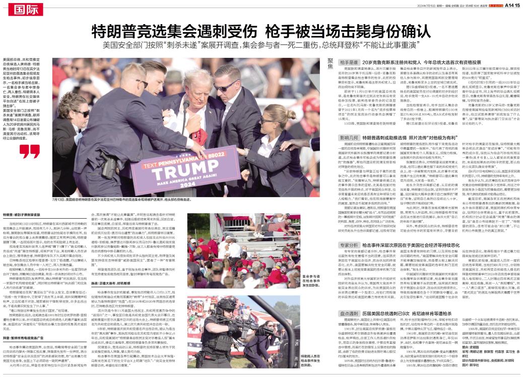 美国前总统、共和党推定总统候选人唐纳德·特朗普当地时间13日在宾夕法尼亚州的竞选集会现场发生枪击事件。