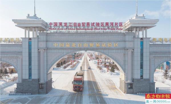 车辆驶出中国(黑龙江)自由贸易试验区黑河片区大门(2023年2月11日摄)。