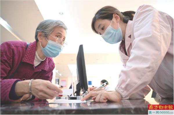 福建省三明市第一医院医保办工作人员(右)向前来咨询药品报销问题的居民讲解相关政策(2020年11月18日摄)。