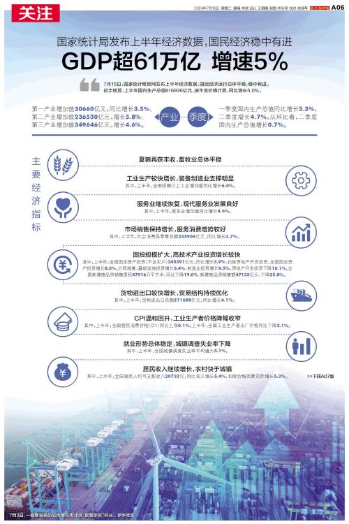7月15日,国家统计局官网发布上半年经济数据,国民经济运行总体平稳,稳中有进。