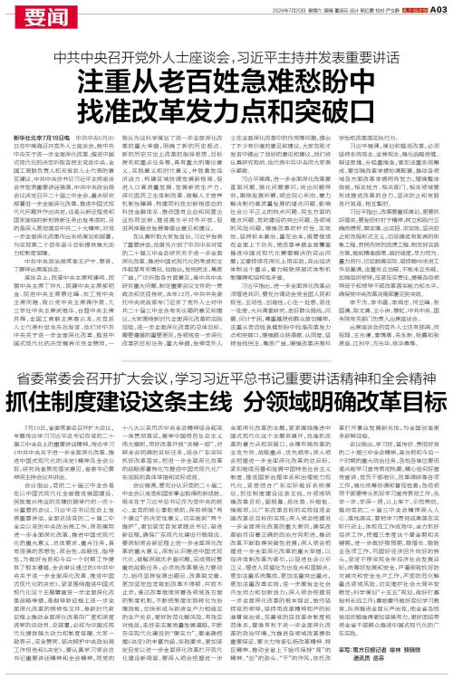 7月19日,省委常委会召开扩大会议,专题传达学习习近平总书记在党的二十届三中全会上的重要讲话精神。