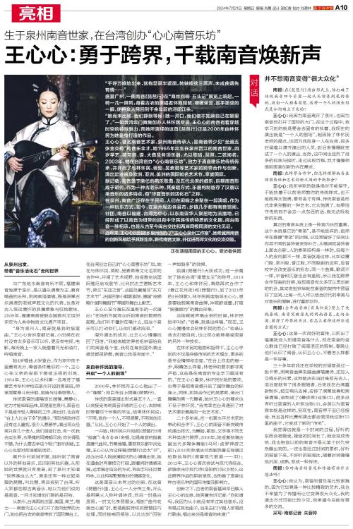 近年来,王心心回到故乡泉州创办了“王心心泉州工作室”,她希冀用南音的创新风格给予其新生命,薪传南音文脉,并促进两岸文化的交流交融。