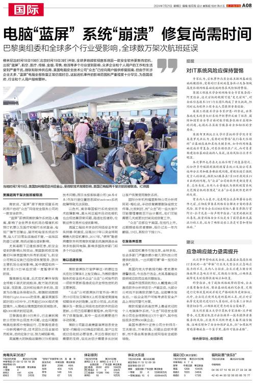 格林尼治时间18日19时(北京时间19日3时)开始,全球多地微软视窗系统因一款安全软件更新而宕机,出现“蓝屏”,航空、医疗、传媒、金融、零售、物流等多个行业受到影响。