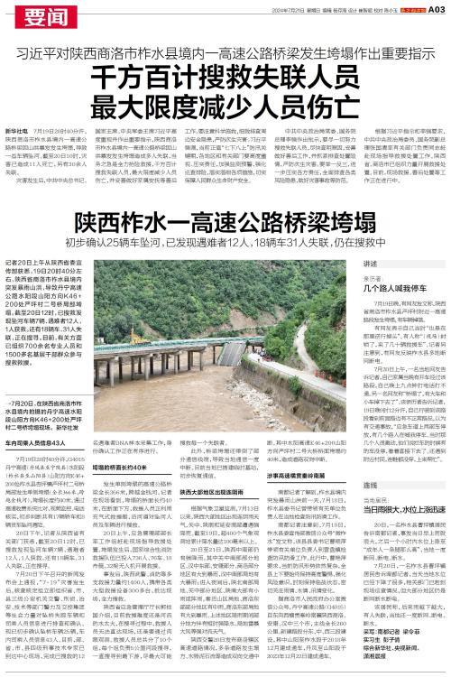 7月19日20时40分许,陕西商洛市柞水县境内一高速公路桥梁因山洪暴发发生垮塌,导致一些车辆坠河。