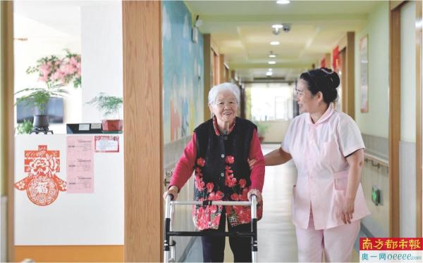 2024年5月25日,在山东省日照市东港区石臼街道日照幸福护理院,工作人员在陪护老人。