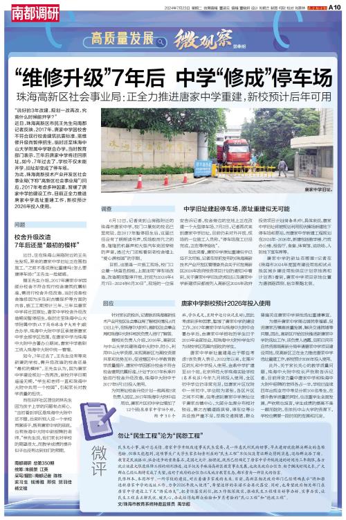 为此,珠海高新技术产业开发区社会事业局(下称“高新区社会事业局”)回应,2017年考虑多种因素,暂缓了唐家中学的建设工作,目前正全力推进唐家中学选址重建工作,新校预计2026年投入使用。