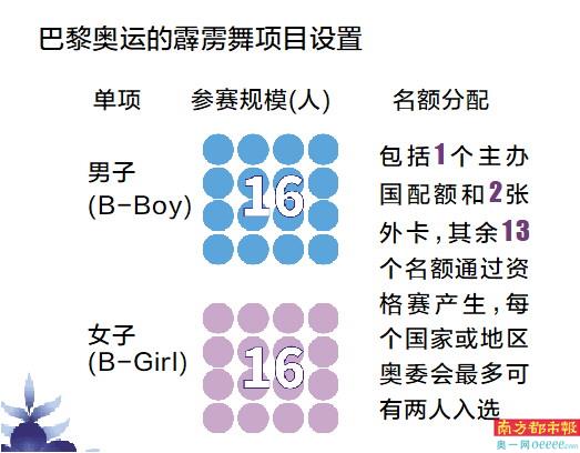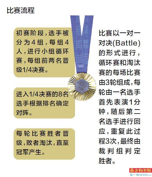 2024巴黎奥运会的霹雳舞项目包括两个单项——男子和女子,共32位选手参赛,男、女各16人。男性舞者被称为B-Boy,女性舞者则为B-Girl。当地时间8月9日-10日,他们将在巴黎协和广场向世界展示这项街头文化的独特魅力。