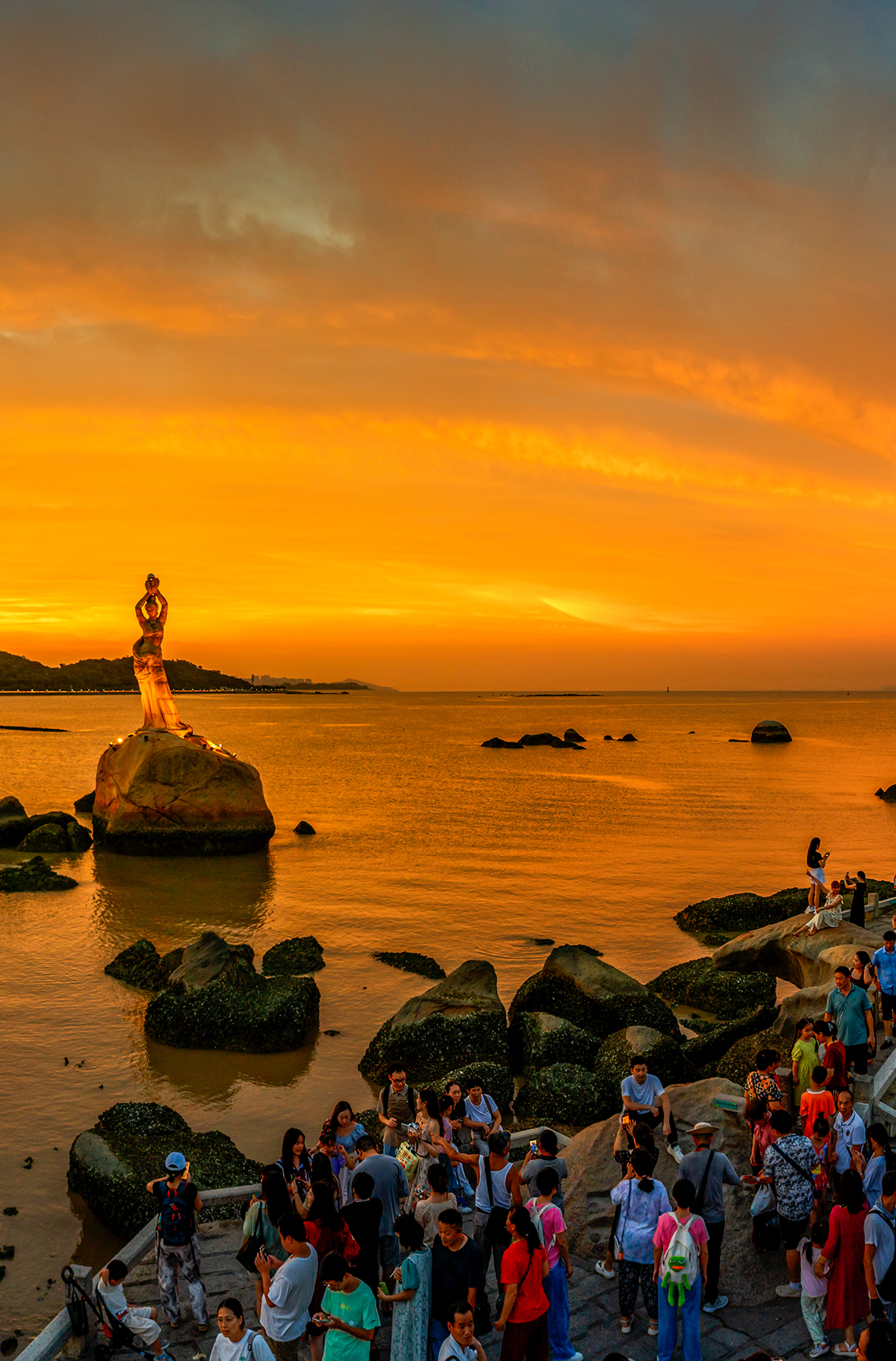 7月24日,珠海渔女雕像前,聚集了前来邂逅晚霞的人。 南都拍客 朱少基 摄