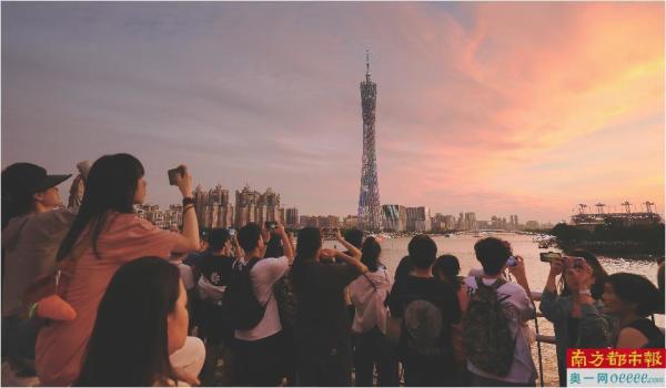 在广州猎德桥,热爱摄影的“老法师”们,下午四五点已将相机支棱起来;他们也不寂寞,一到落日时分,成千上万的市民、游客就聚集到摄影师们身边,见缝插针寻找着心仪的画面构图。