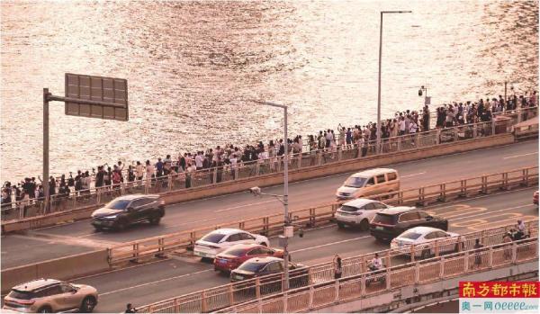 广州猎德大桥上的游客聚集到摄影师们身边,见缝插针寻找着心仪的画面构图。 南都拍客 林伟斌 摄
