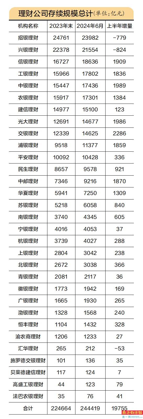 从不同机构存续理财规模看,银行理财子公司占据最大份额。截至6月末,银行理财子公司存续理财规模24.4万亿,占银行理财总规模近87%。