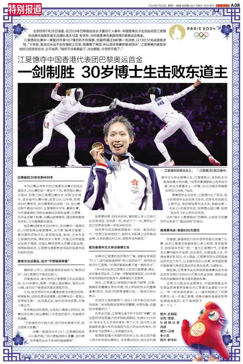 北京时间7月28日凌晨,在2024年巴黎奥运会女子重剑个人赛中,中国香港女子击剑运动员江旻憓为中国香港代表团夺得巴黎奥运会首金。