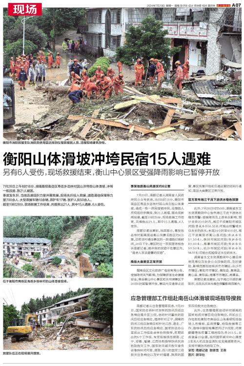 7月28日上午8时18分,湖南衡阳南岳区寿岳乡岳林村因山洪导致山体滑坡,冲垮一栋民房,致21人被困。