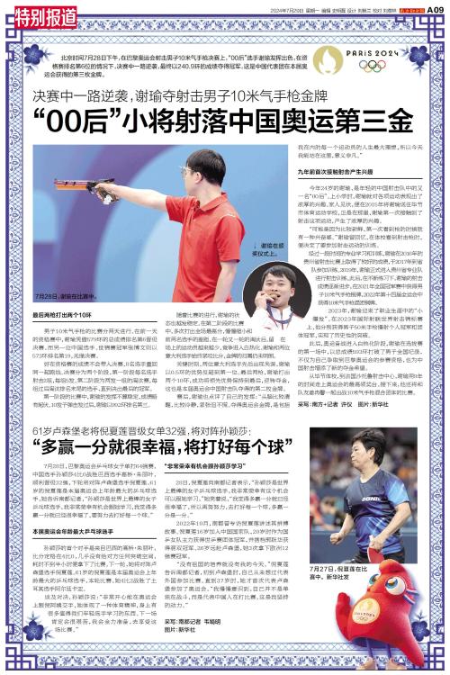 北京时间7月28日下午,在巴黎奥运会射击男子10米气手枪决赛上,“00后”选手谢瑜最终以240.9环的成绩夺得冠军。