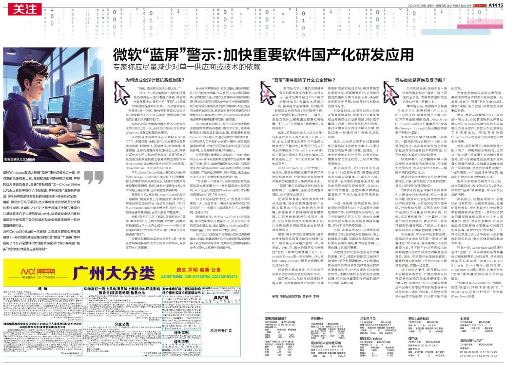 微软“蓝屏”警示:加快重要软件国产化研发应用