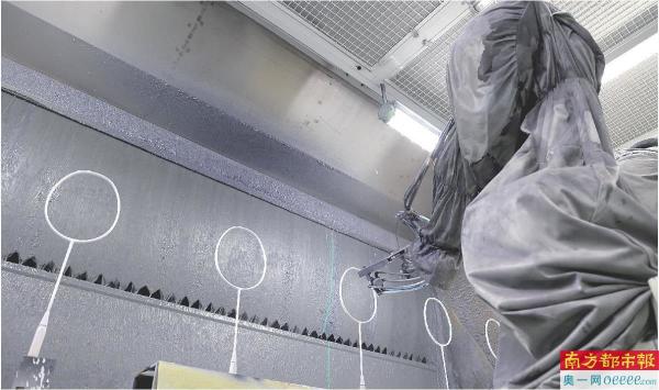 河源昂泰复合材料有限公司车间内,喷涂机器人生产线正在给球拍喷漆。