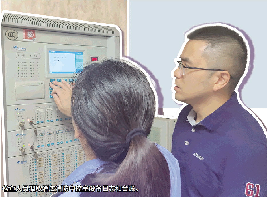 此次明查暗访行动中,为核查酒店“安全软件”配备是否到位,综合检查组每抽查一处酒店,不仅要交叉问询酒店负责人和员工、查阅酒店消防控制室的台账,还随机抽查酒店员工演示使用消防设备、触发现场火灾报警检验酒店响应措施等。