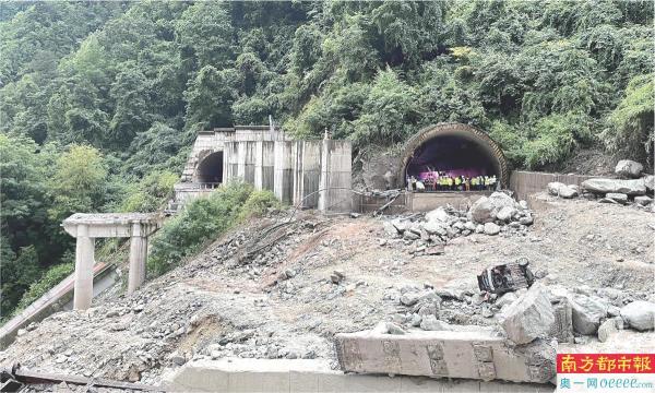 雅康高速四川甘孜藏族自治州康定至泸定段日地1号隧道至2号隧道隧间桥垮塌现场。
