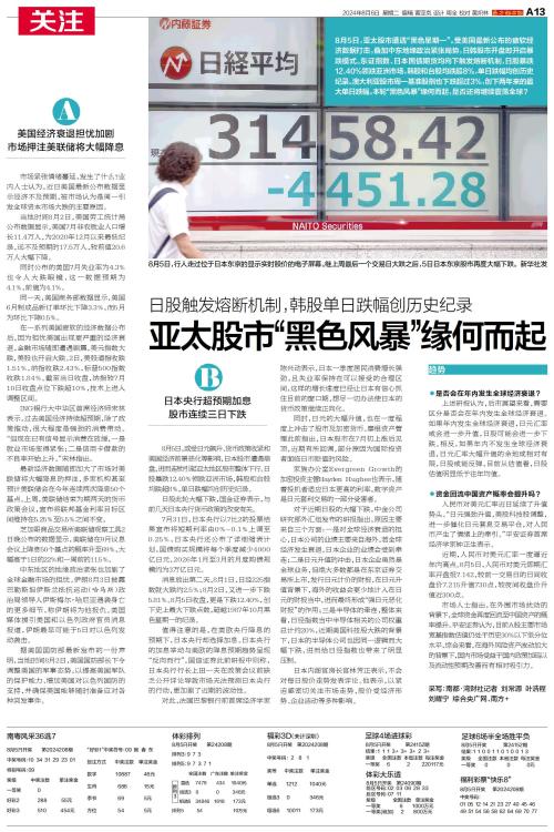 8月5日,或受日元飙升、货币政策收紧和美国经济前景恶化等影响,日本股市遭遇崩盘,进而连锁引起亚太地区股市整体下行。日股暴跌12.40%领跌亚洲市场,韩股和台股均跌超8%,单日跌幅均创历史纪录。