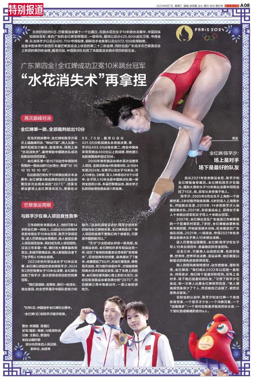 北京时间8月6日,巴黎奥运会第十一个比赛日,在跳水项目女子10米跳台决赛中,中国双姝包揽冠亚军,来自广东的全红婵发挥稳定,一路领先,最终以总分425.60分成功卫冕,夺得金牌,队友陈芋汐以总分420.