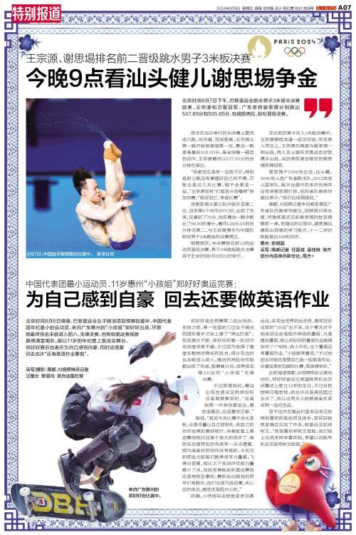 北京时间8月7日下午,巴黎奥运会跳水男子3米板半决赛结束,王宗源和卫冕冠军、广东老将谢思埸分别跳出537.85分和505.85分,包揽前两位,轻松晋级决赛。