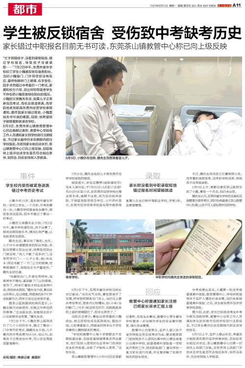 “忙于照顾孩子,没看到录取短信,错过学校报名,导致孩子没被录取……”7月2日中午,东莞市誉华学校初三学生小魏被反锁在宿舍阳台。当时小魏敲门,门外同学却没有反应,最终他砸碎门上玻璃,右手受伤,因手术而错过中考最后一门考试。家属和校方介绍,派出所称同宿舍学生不存在把小魏恶意锁在阳台的情况。