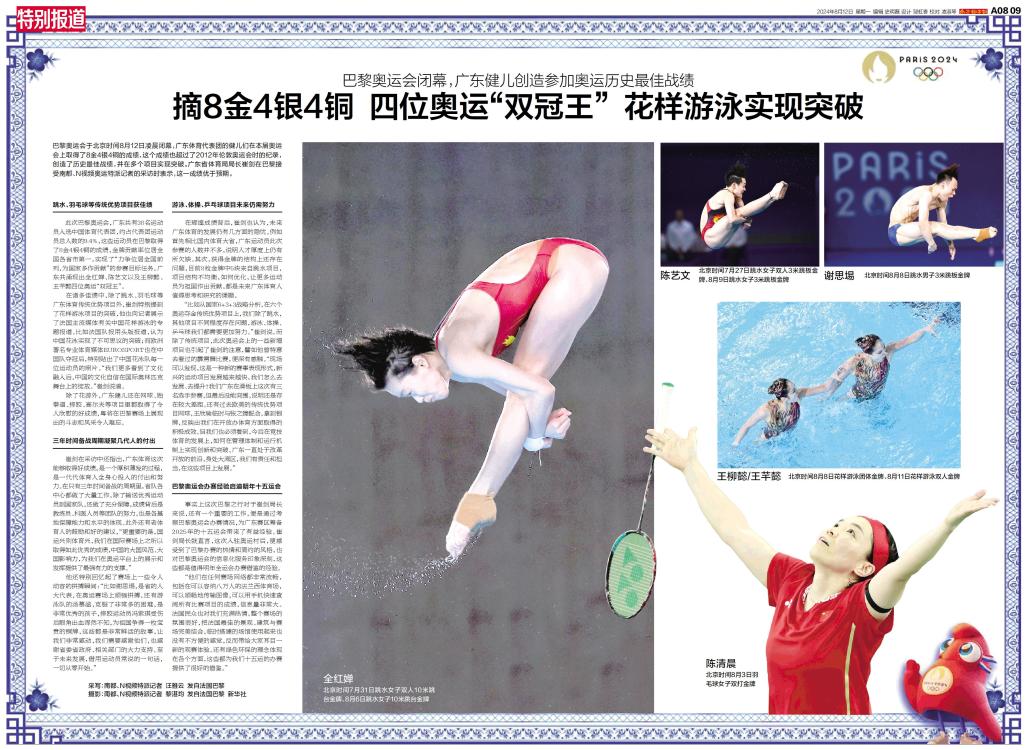 巴黎奥运会于北京时间8月12日凌晨闭幕,广东体育代表团的健儿们在本届奥运会上取得了8金4银4铜的成绩。