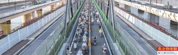 “电鸡”开上铁路桥,珠江大桥西桥慢行道早晚高峰拥堵。 南都记者 张志韬 摄