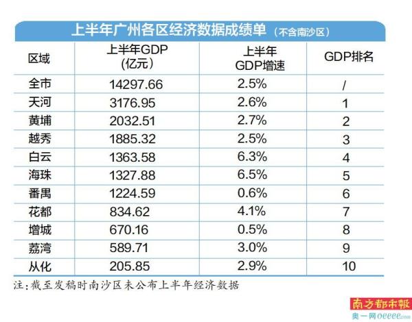 上半年黄埔区以GDP2032亿、增长2.7%的数据,反超了越秀的1885亿、增长2.5%,而白云则以GDP1363亿元的表现,压倒了海珠区的1327亿。